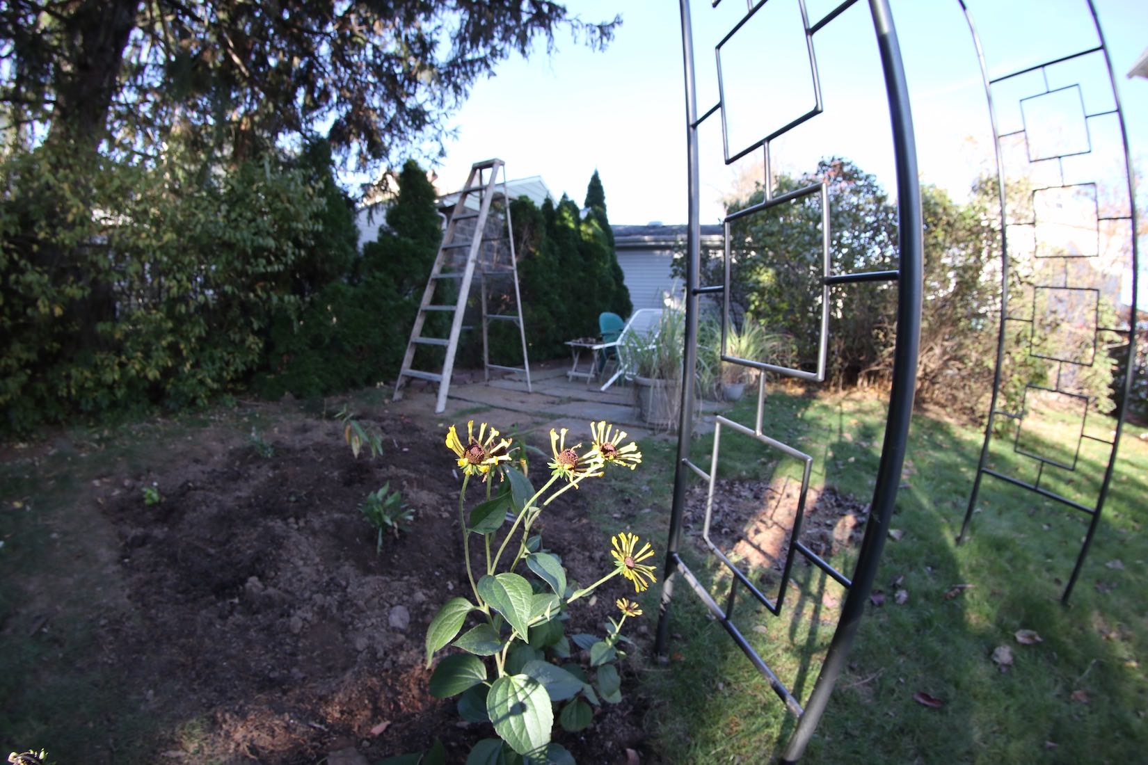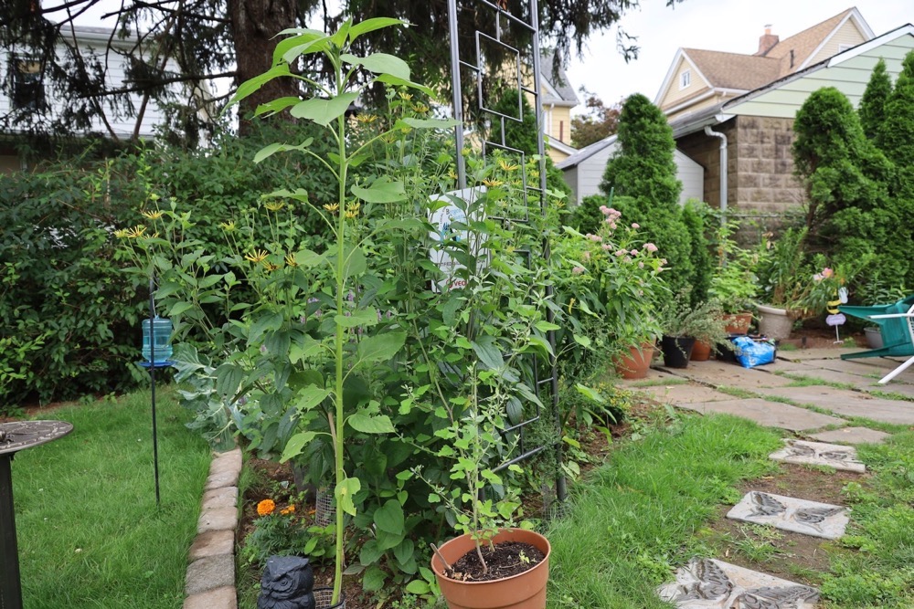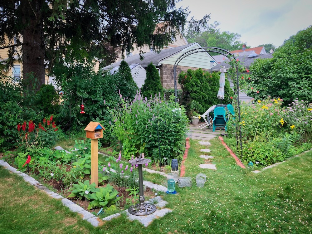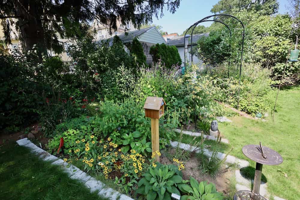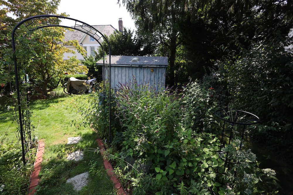 To begin the garden an arbor was placed leading to a patio that was made previously using repurposed slate stones from a walkway. Then the right side of the garden area was created and some plants were added by moving existing ones from the front area of the house. Mountain mint and Henry Eiler's rudbeckia were moved and some asters were added.