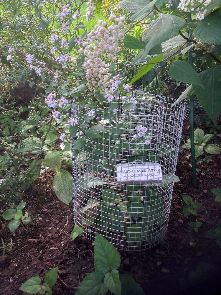 Plants being transferred from the porch to the garden. Discovered that the plants needed fences to prevent being eaten by bunnies(?) which are numerous. Made fences for individual plants but in retrospect enclosing the whole area would probably have been easier and better until the plants were better established. Asters and cone flowers were the hardest hit and slowest to recover. In fact, cone flowers never did recover which is the biggest disappointment.