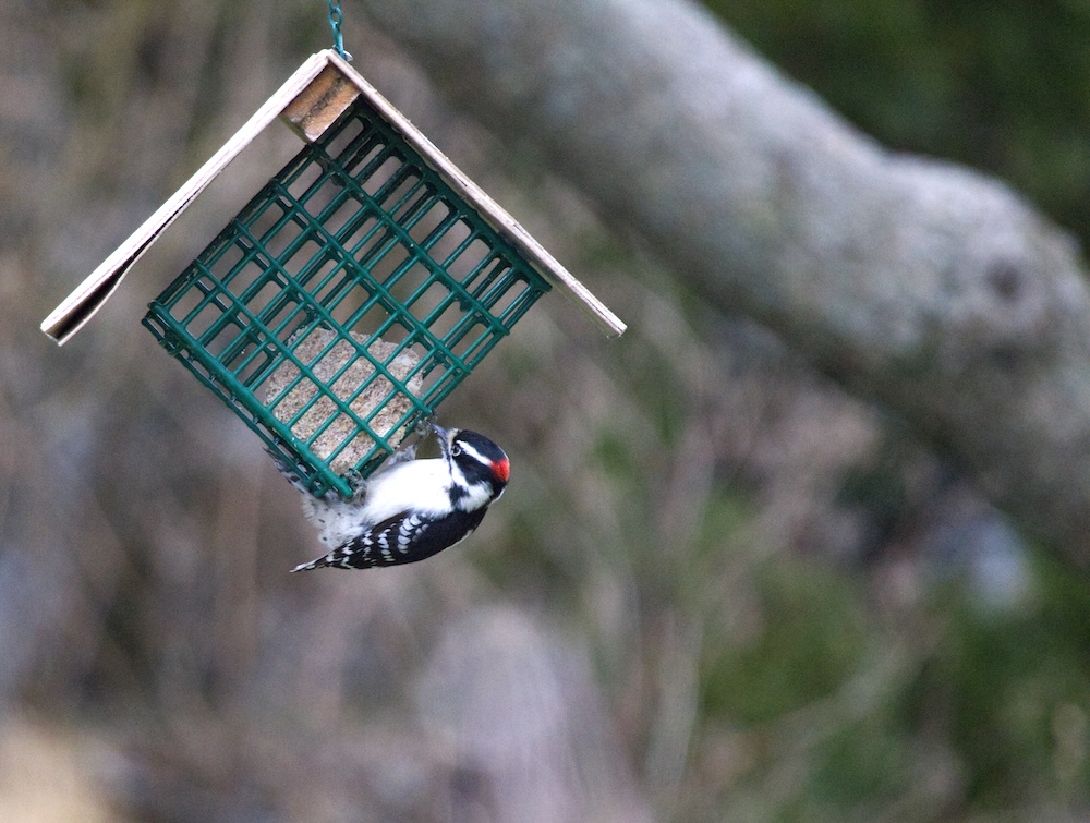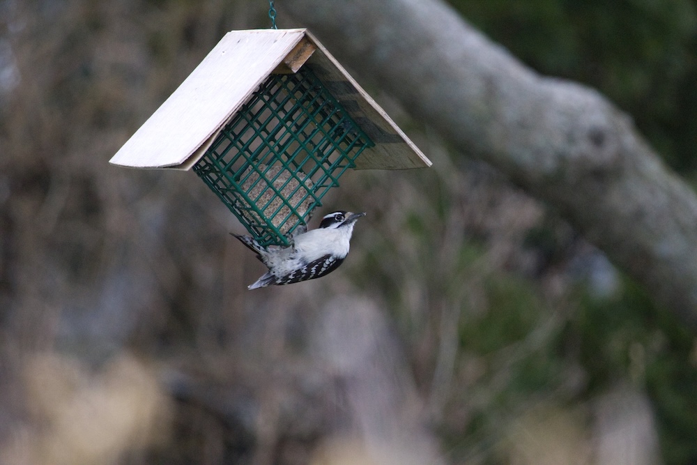 Just a Downy Woodpecker visiting suet near the garden.