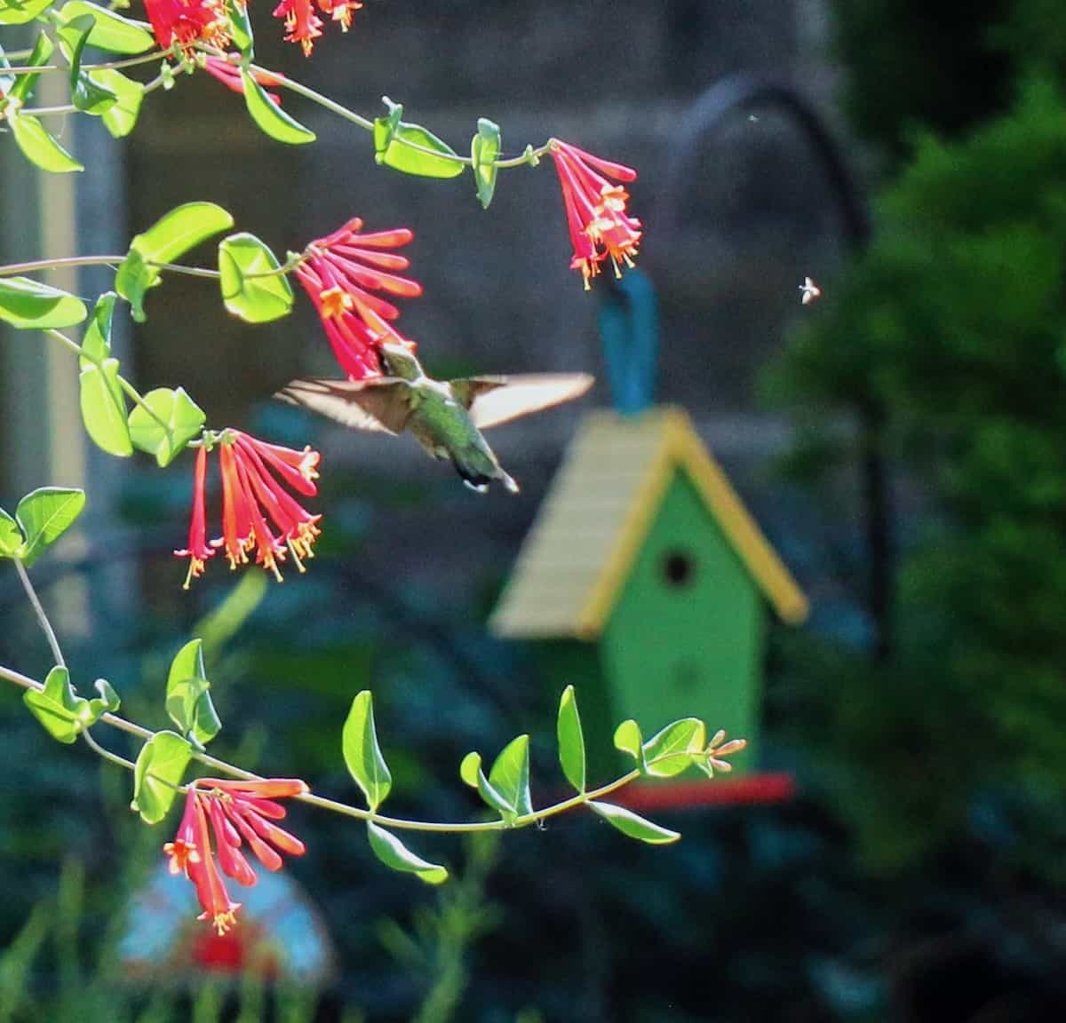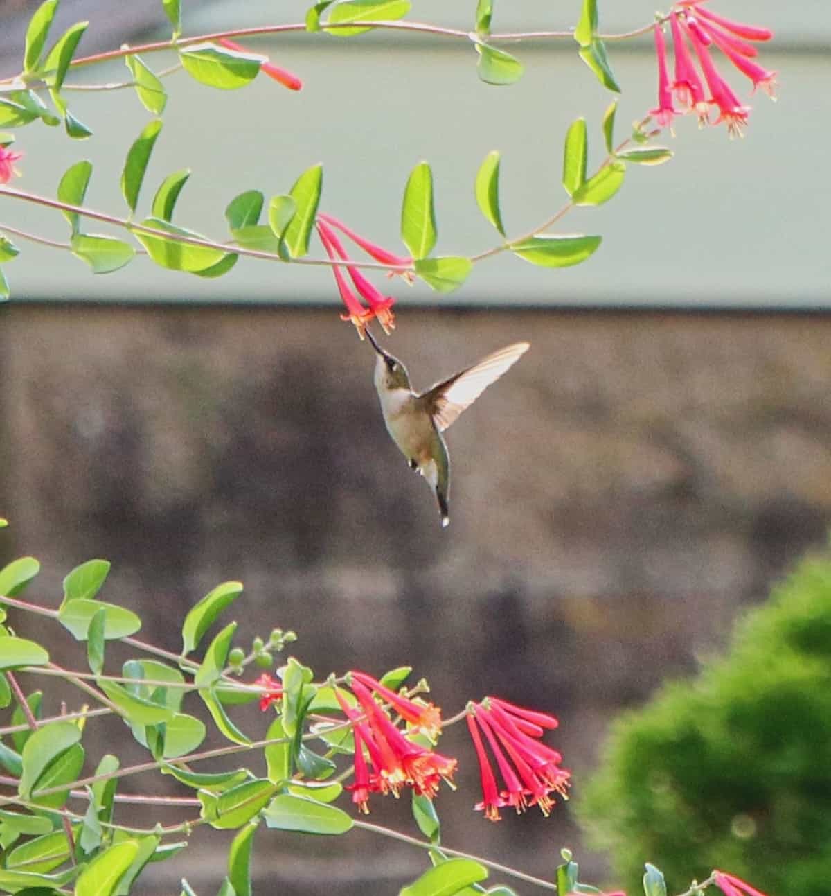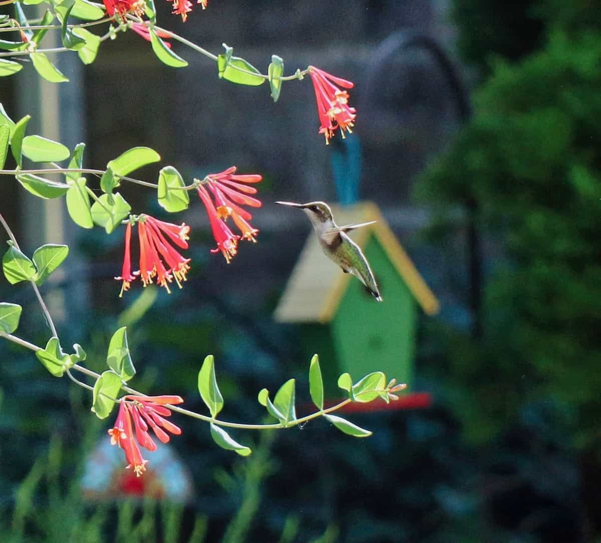 A delightful hummingbird visited the coral honeysuckle on obelisk and stayed several days which was very entertaining.