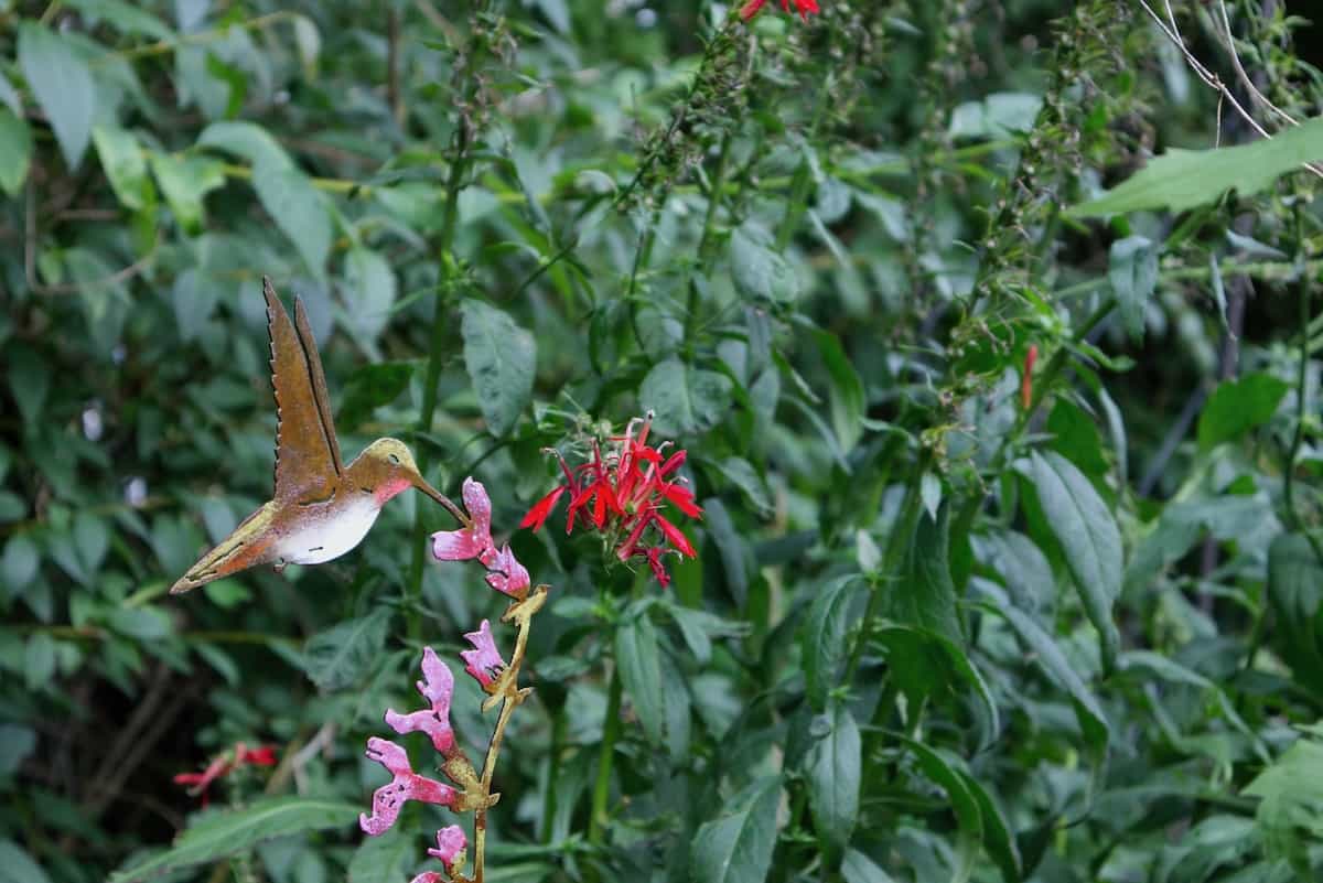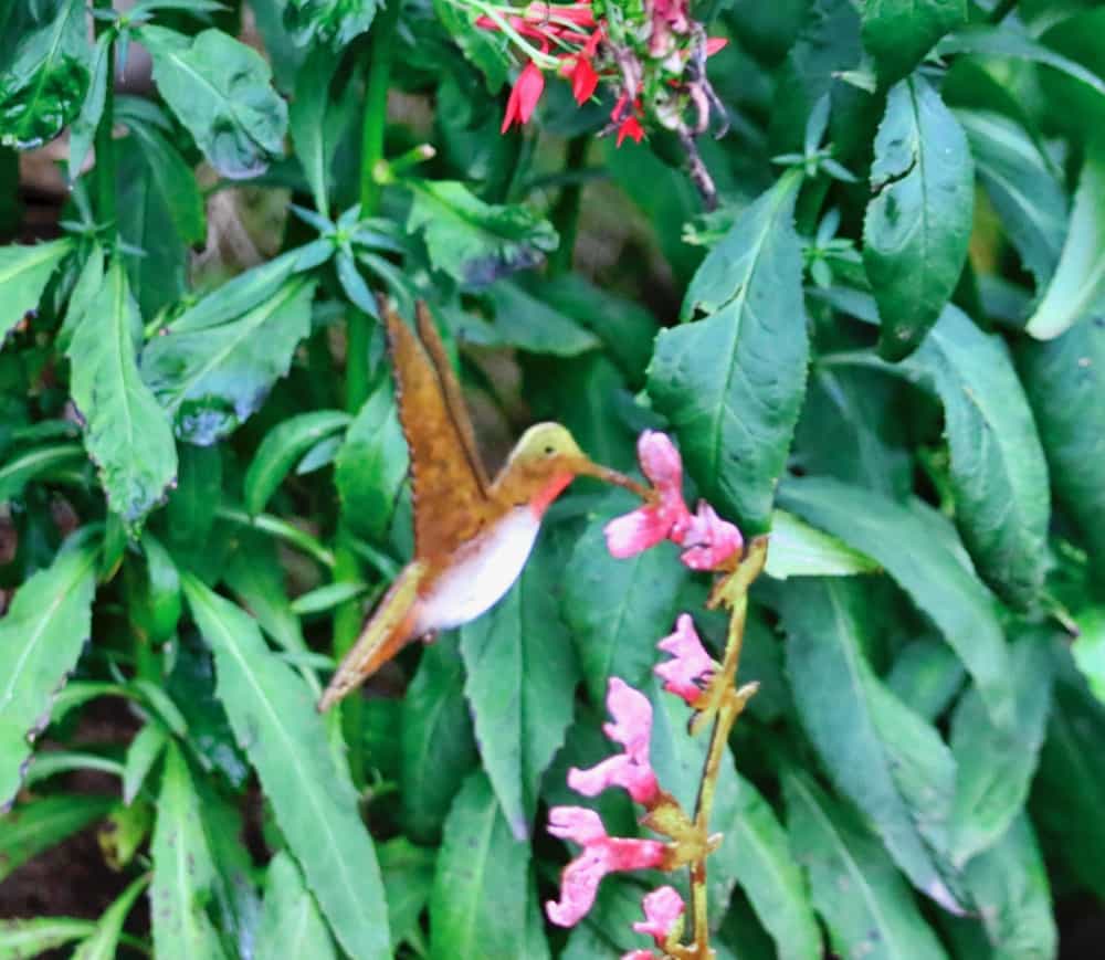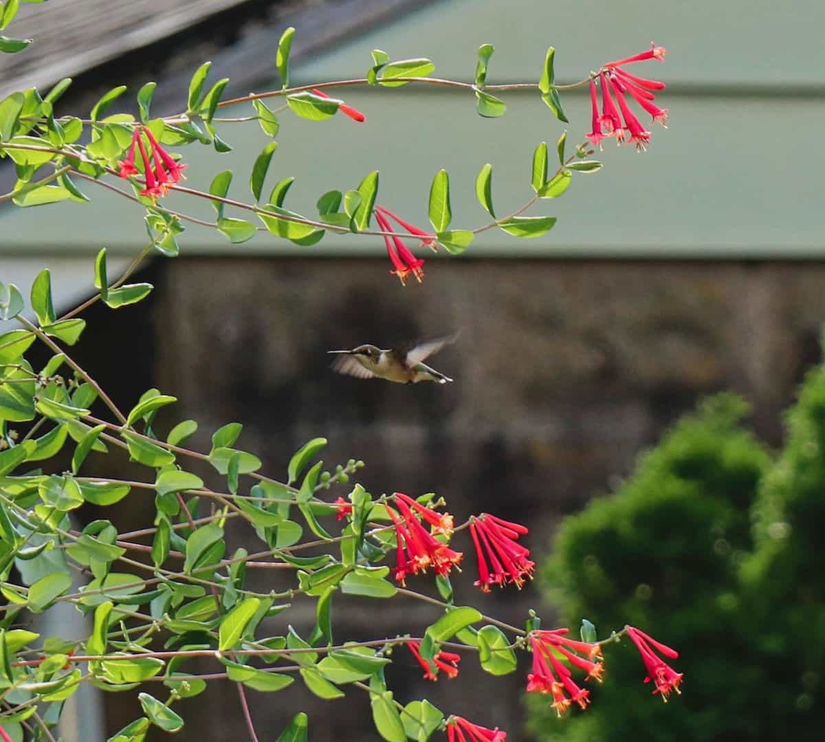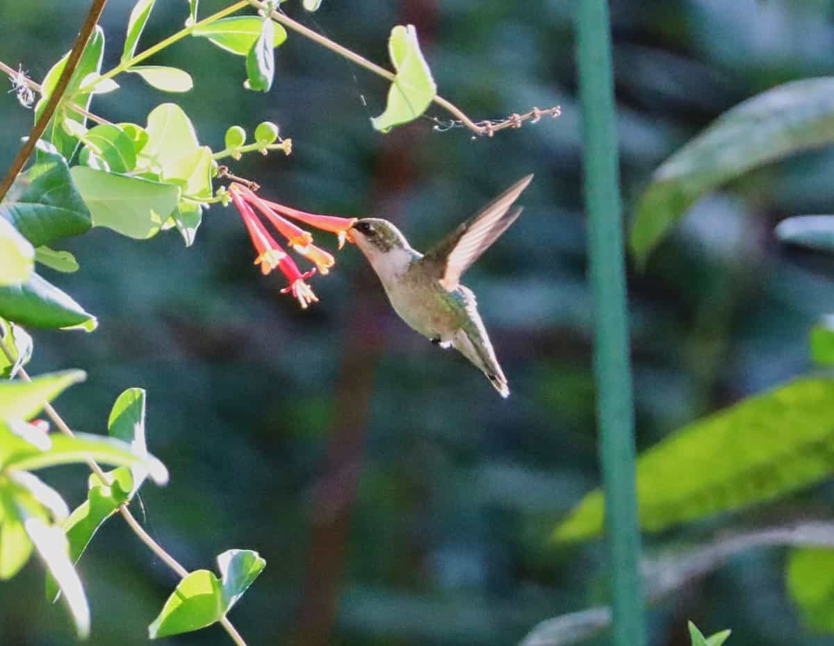 A delightful hummingbird visited the coral honeysuckle on obelisk and stayed several days which was very entertaining.