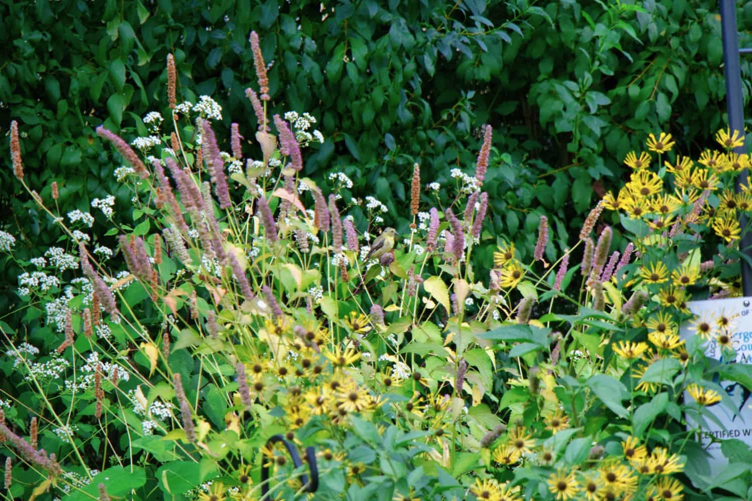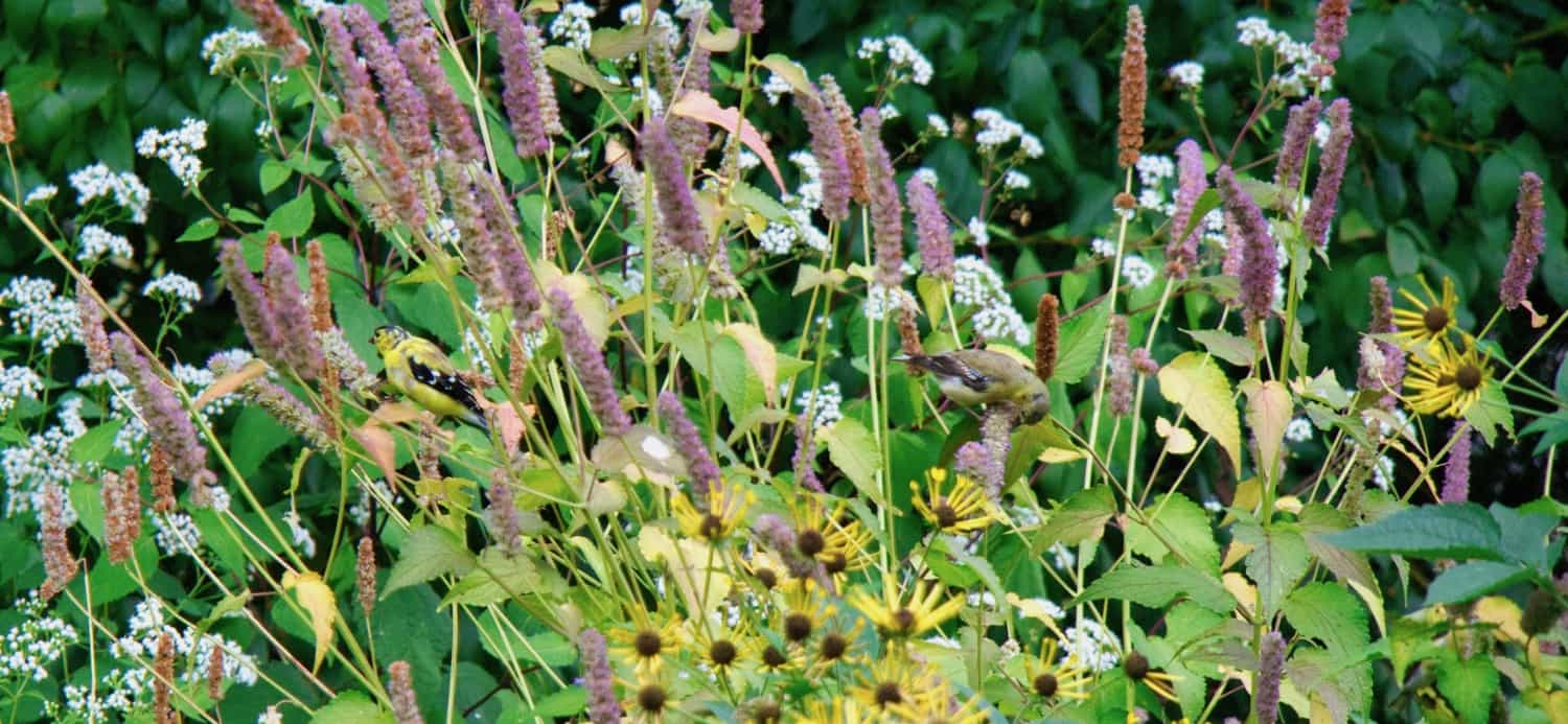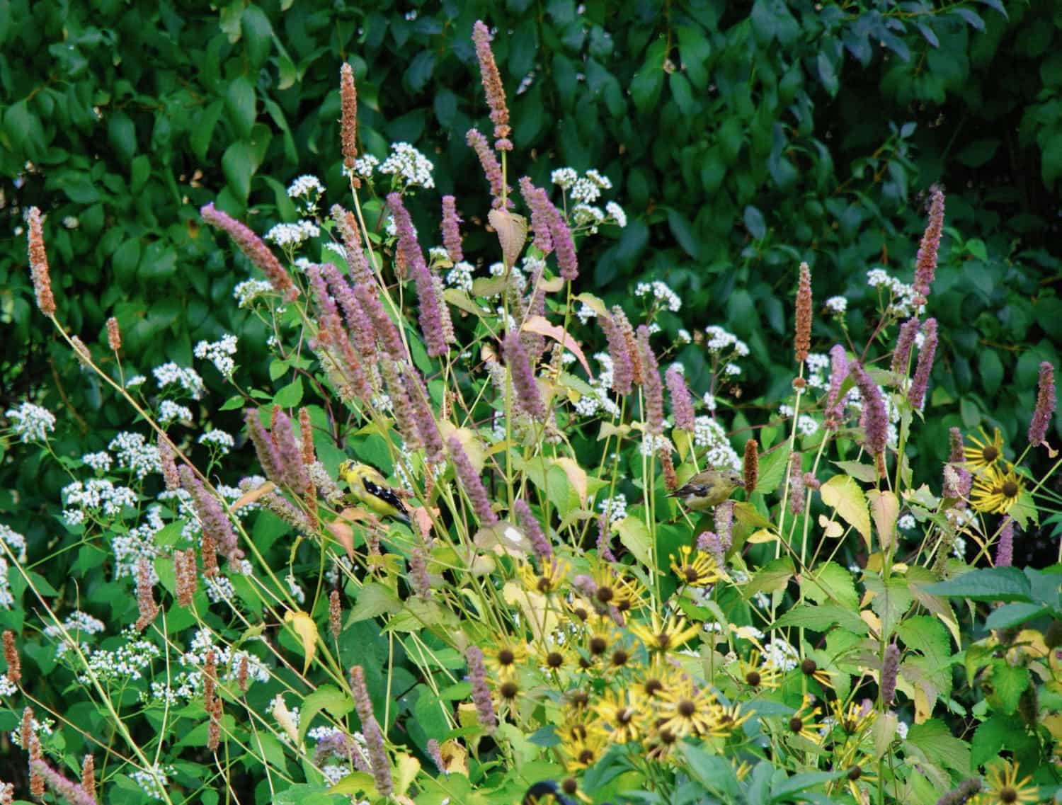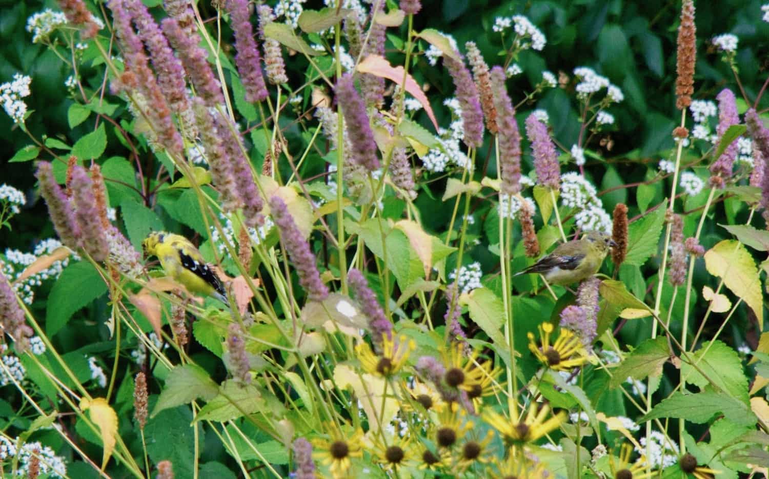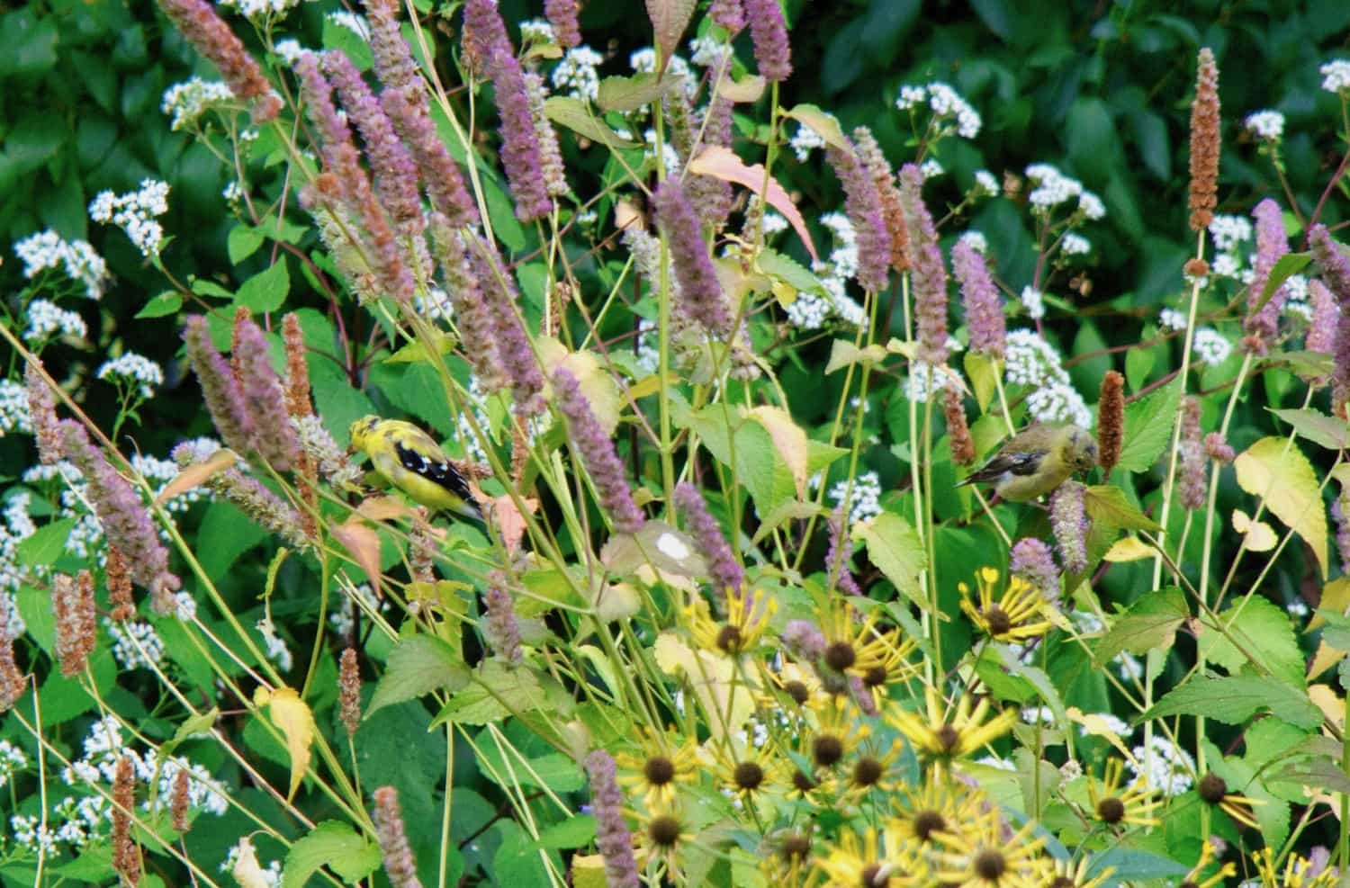 Goldfinches are always nearby but this week had a nice visit from a pair who were happy to spend some extended time in the Swamp Milkweed - Prairie Coneflower area of the garden.