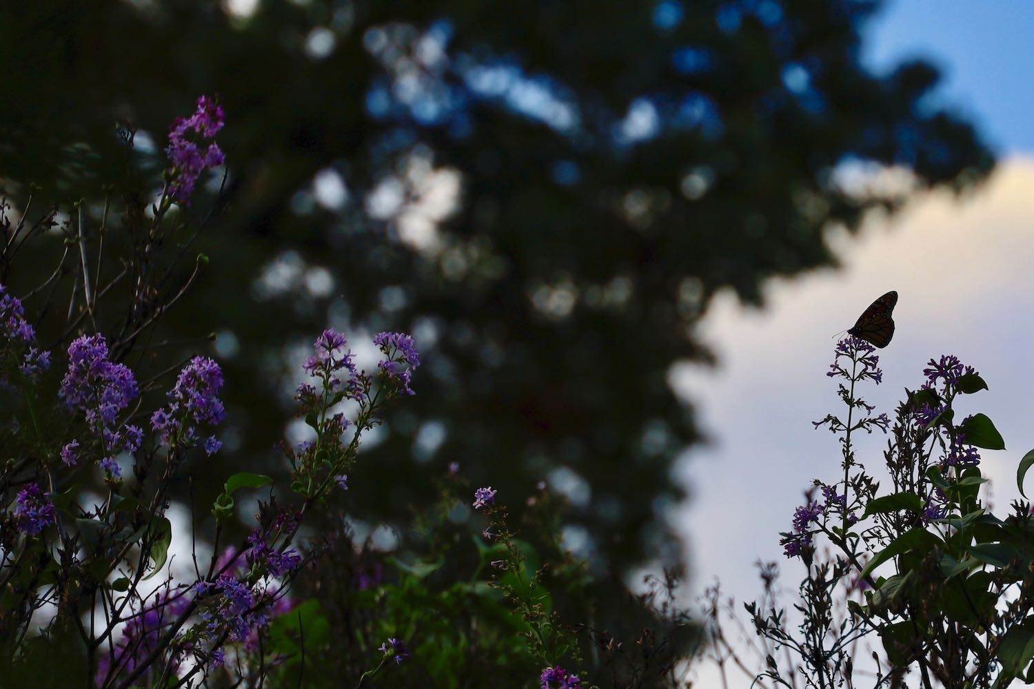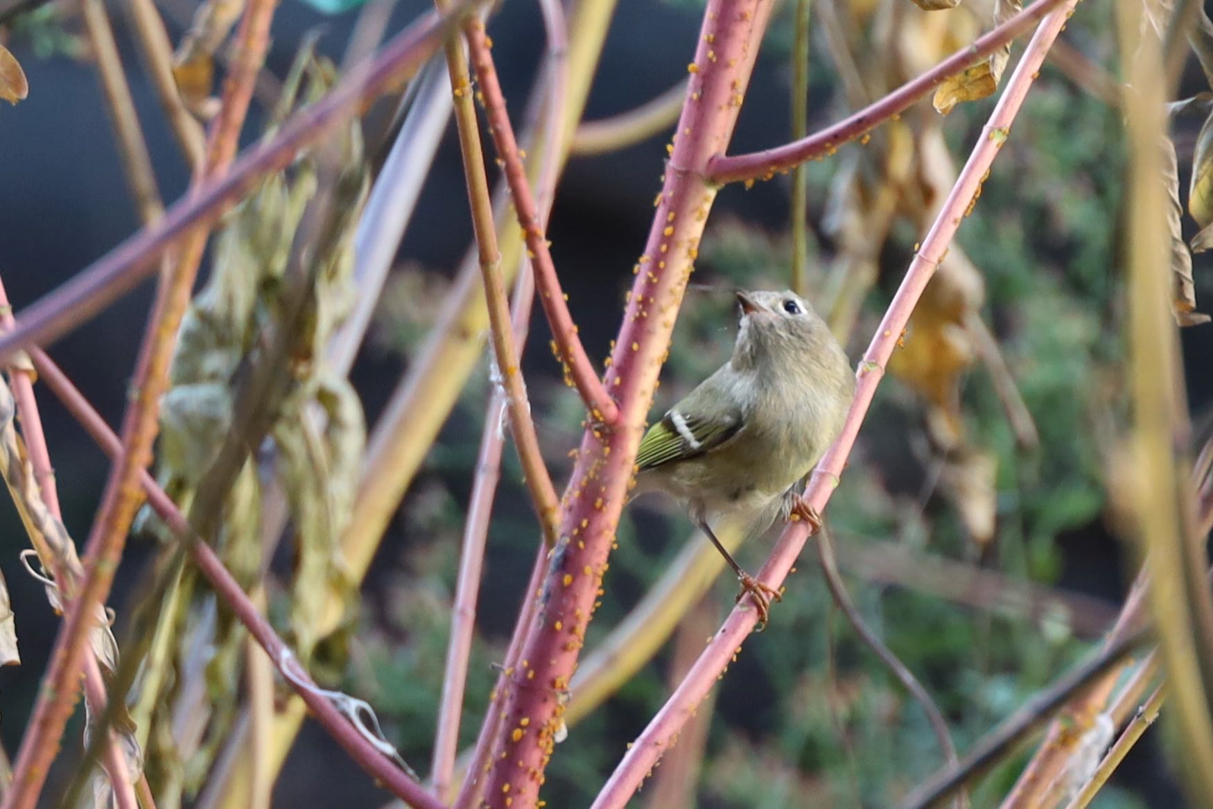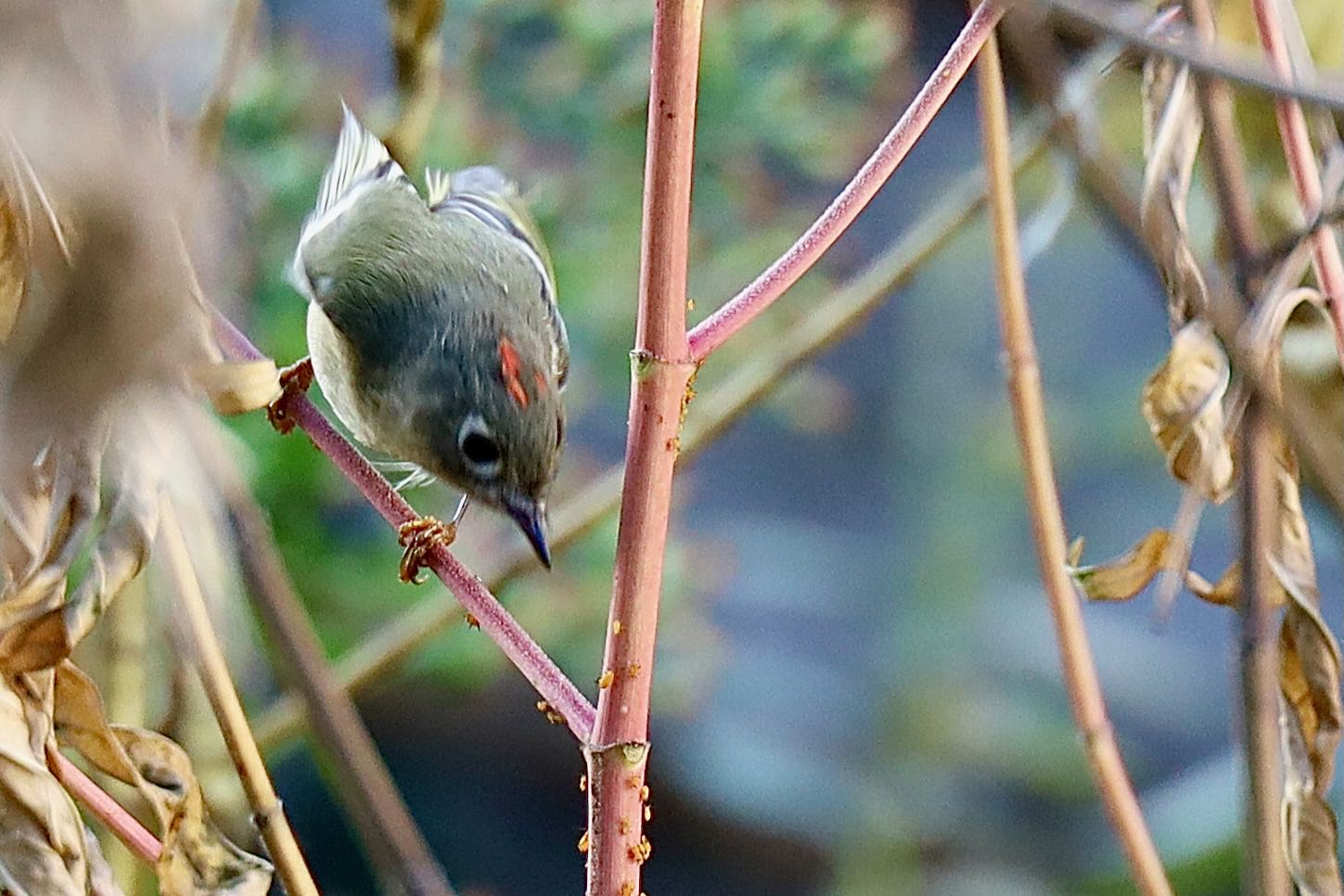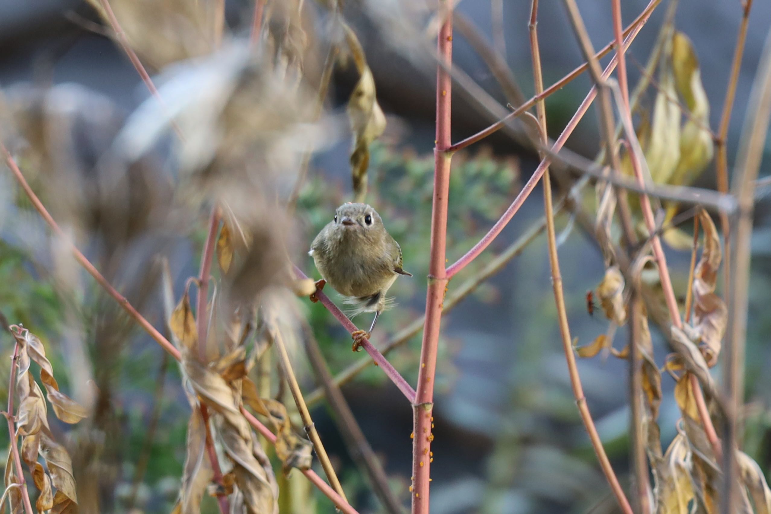 While doing some light cleanup (weeding) in the garden, I felt a light tap on my back and wondered if it was starting to rain. It turned out to be a tiny Ruby-crowned Kinglet flying around between the garden milkweed and the lilac bush that had brushed my shoulder or briefly alighted. On further study there were several flying around! Had to get the camera out…. The little birds were difficult to photograph as they never really stopped flying around rarely stopping. Also, surprised to see a Monarch butterfly on the lilac bush.