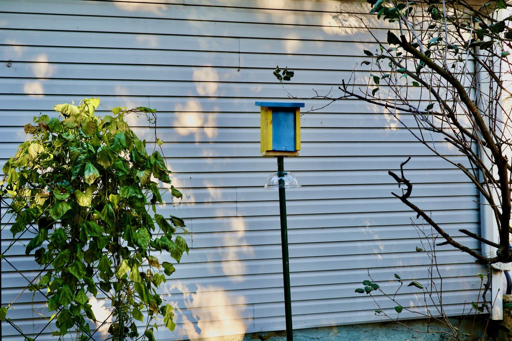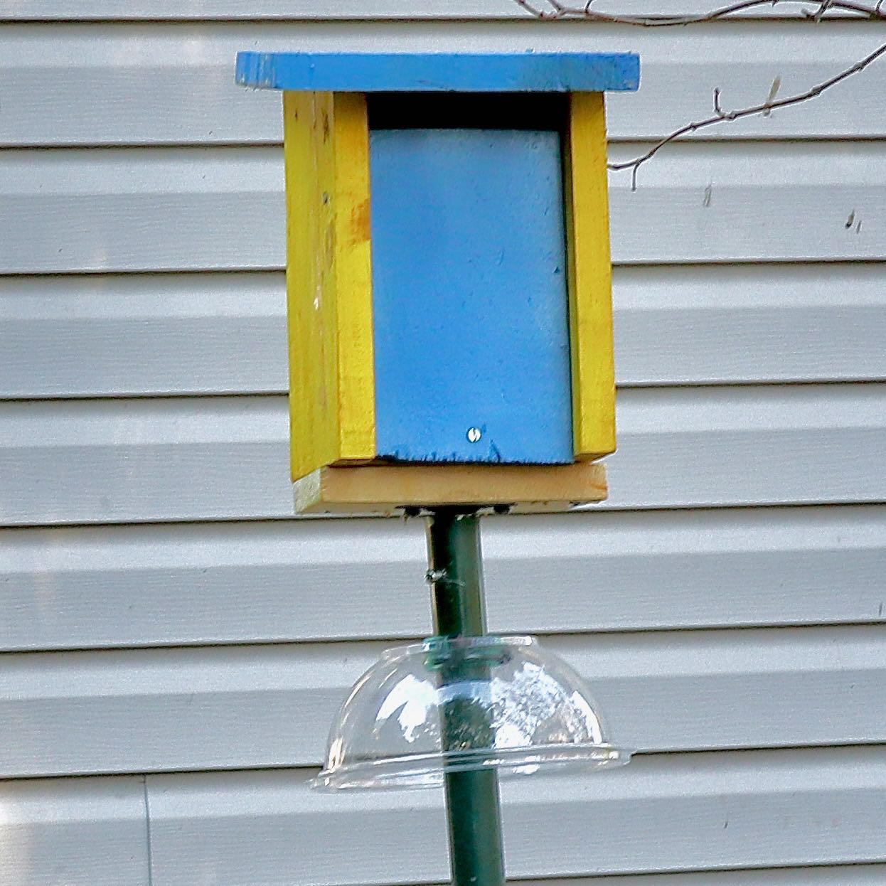 Removed an older birdhouse set in the lilac bush that was well used but wanted to replace it with one that was more wren or chickadee friendly after seeing this style on a walk at the Frank Chapman trail. Trying something new with the birdhouse entry not used before.